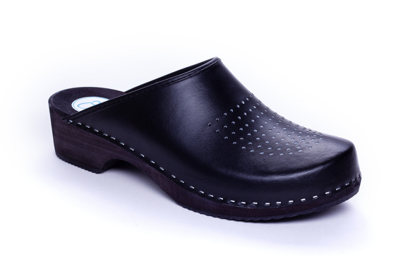 Model BRUNO to ręcznie wykonane chodaki medyczne z naturalnego, bejcowanego na czarno drewna topolowego i skóry bydlęcej. Posiadają wyprofilowaną wkładkę ortopedyczną, która wspiera prawidłową postawę, redukuje zmęczenie i łagodzi bóle stóp. Antypoślizgowa podeszwa z gumką zapewnia stabilność na każdej powierzchni, a elegancka wentylacja i lamówka dodają im profesjonalnego charakteru. Idealne dla mężczyzn pracujących w służbie zdrowia oraz wszystkich ceniących komfort i trwałość.